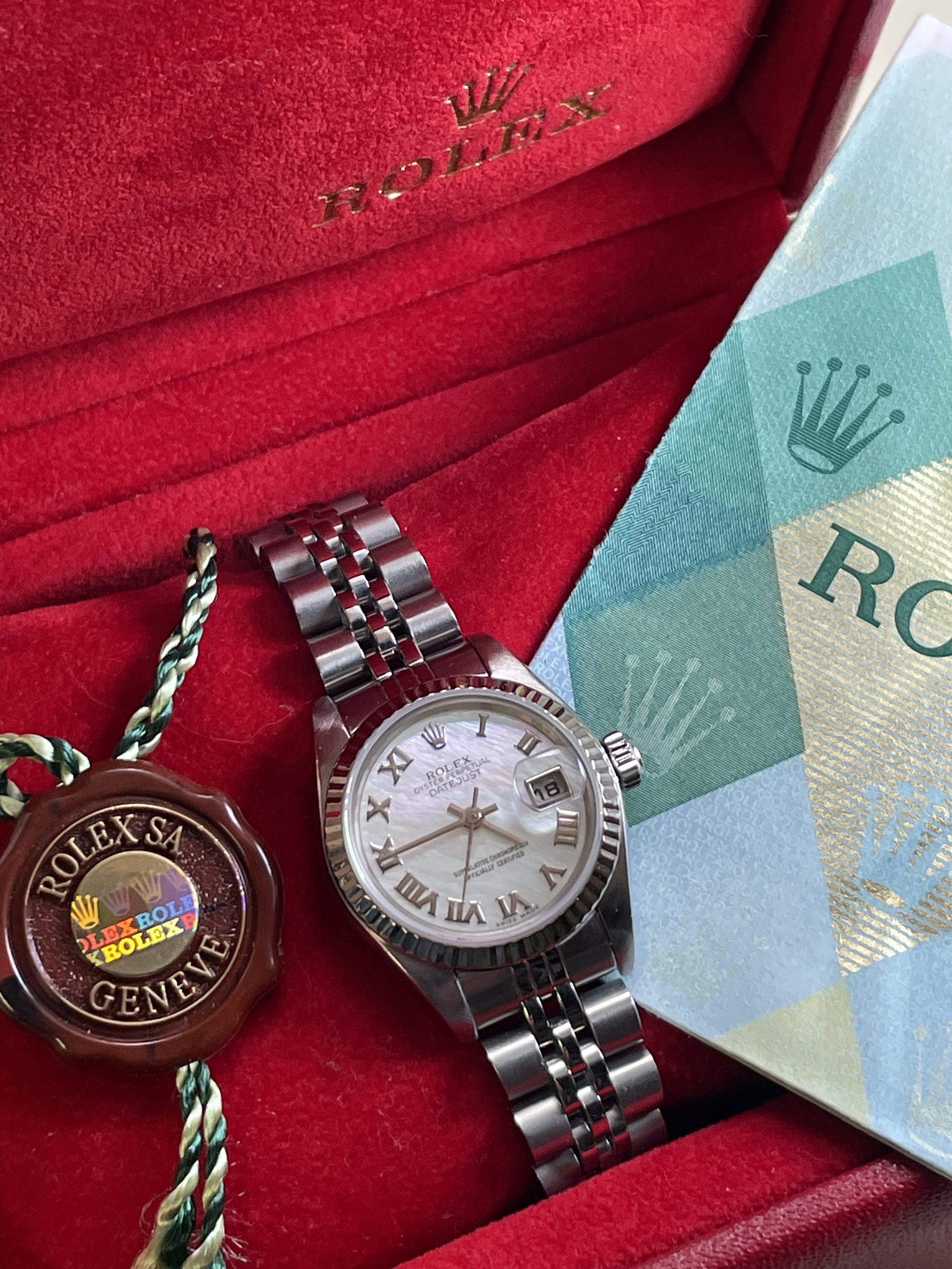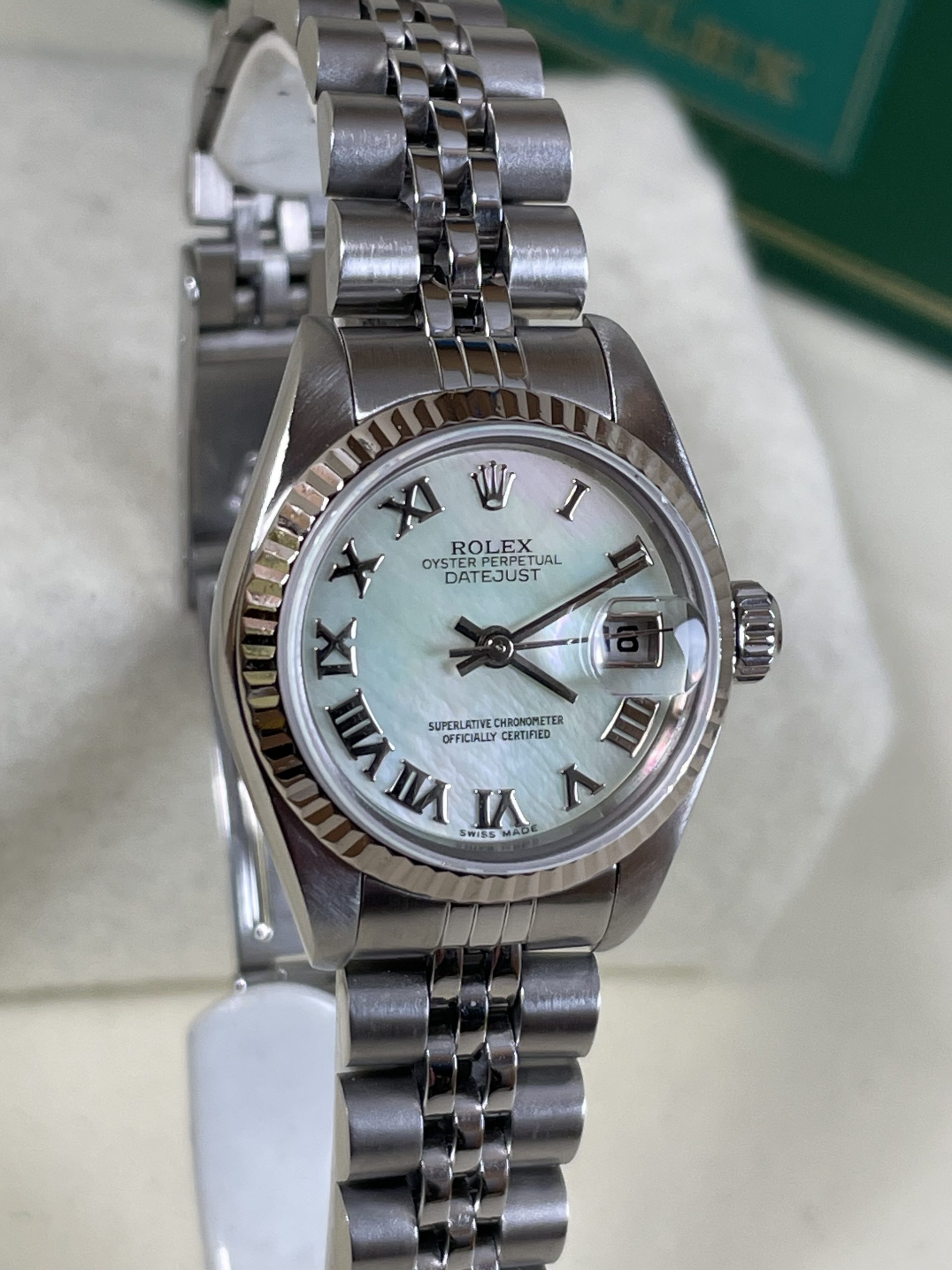 Rolex Ladies Datejust #79174. 26MM Case Size, 18K White Gold Fluted Bezel, Jubilee Bracelet which is tight with full links. Early 2000’s era. Sapphire crystal, clean 2235 movement. Excellent condition throughout. Factory Mother of Pearl Roman which is a real stunner on the wrist! An excellent condition ladies watch, ready to be worn for a lifetime. With it’s original box & Rolex warranty papers. Detailed, serviced, guaranteed. $6,850 Wire/Certified funds.