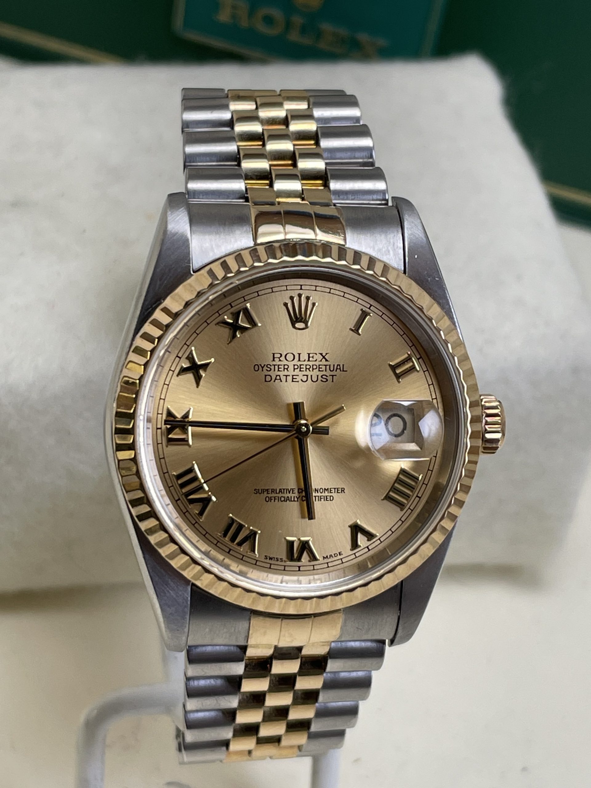 Classic Unisex 36mm Datejust – 2-Tone with 18K Gold and Stainless Steel. 2000’s Model. Sapphire crystal, 3135 Movement, Fluted Bezel, Original Jubilee bracelet which is crisp and in great condition with full links. Champagne Roman dial with applied numerals. A very beautiful, timeless 2 Tone Datejust ready for wear. This comes as a complete set with original warranty papers, Rolex box, booklets. Detailed, serviced, guaranteed. $8450 wire/Certified funds.