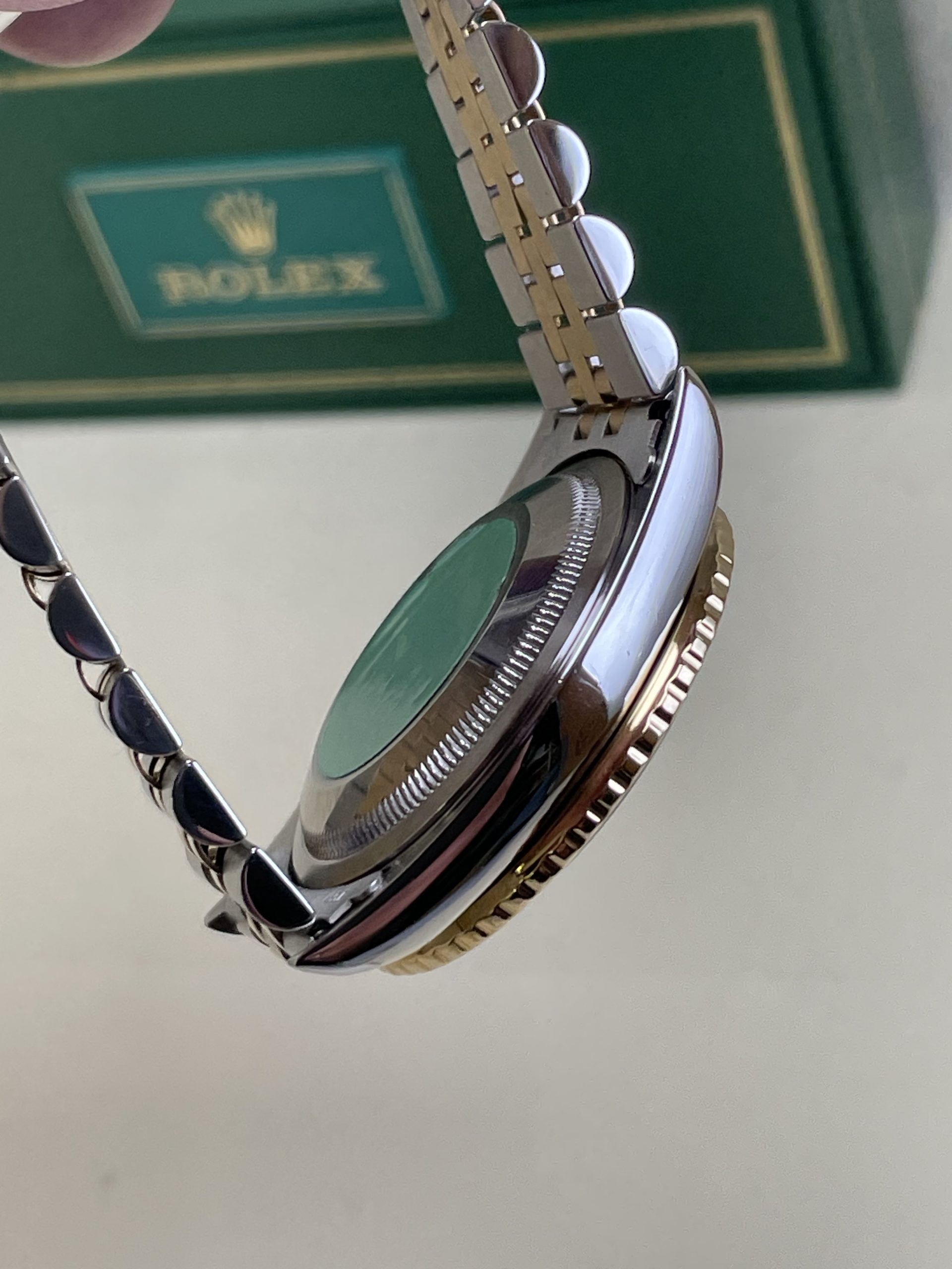 A srare and stunning piece in 36mm, White Roman factory dial, Jubilee bracelet and it’s unique solid 18K rotating bezel. Crisp, like new original condition with original hologram on reverse. Rolex factory serviced, detailed, guaranteed. $7250 wire/certified funds.