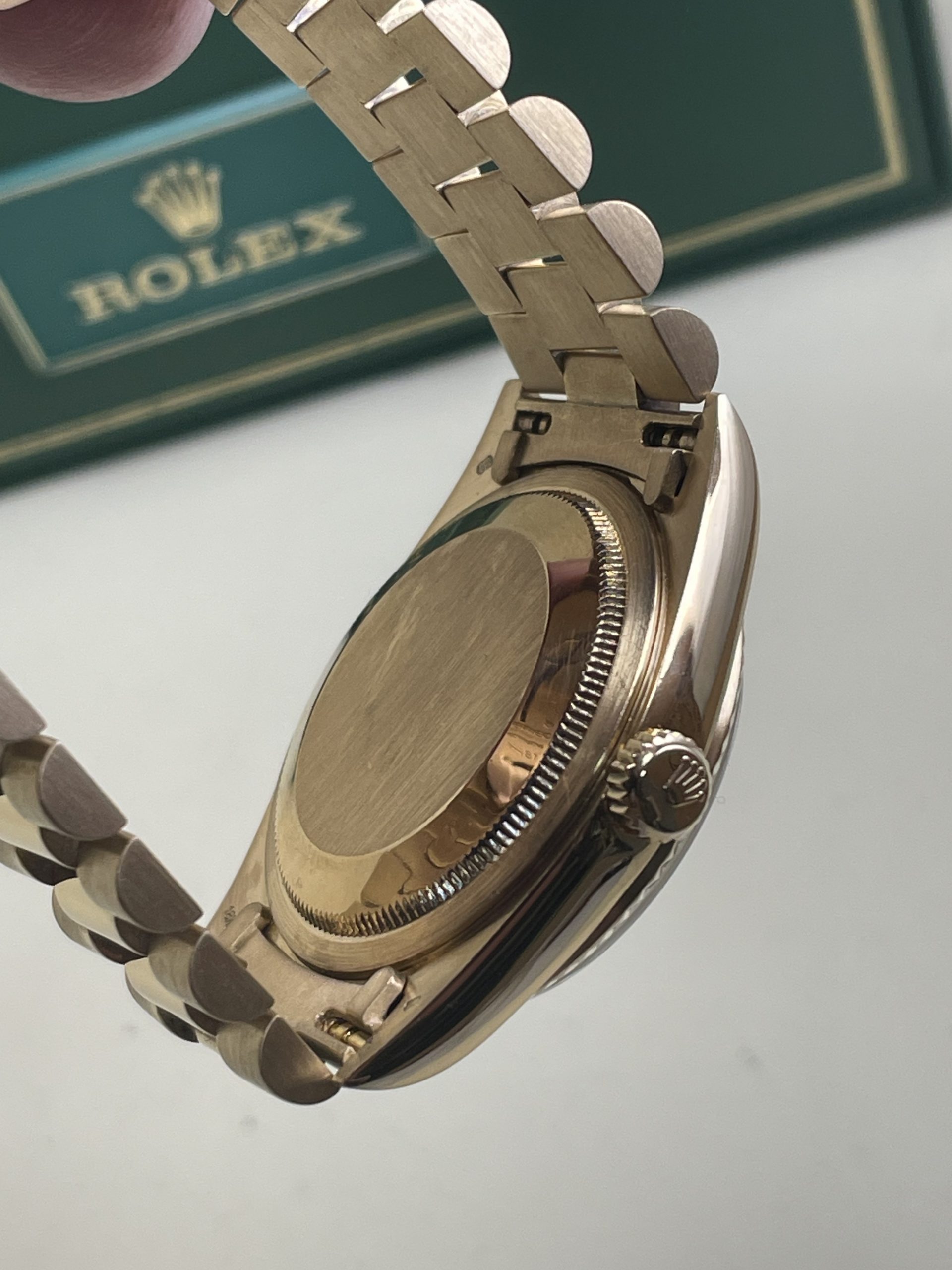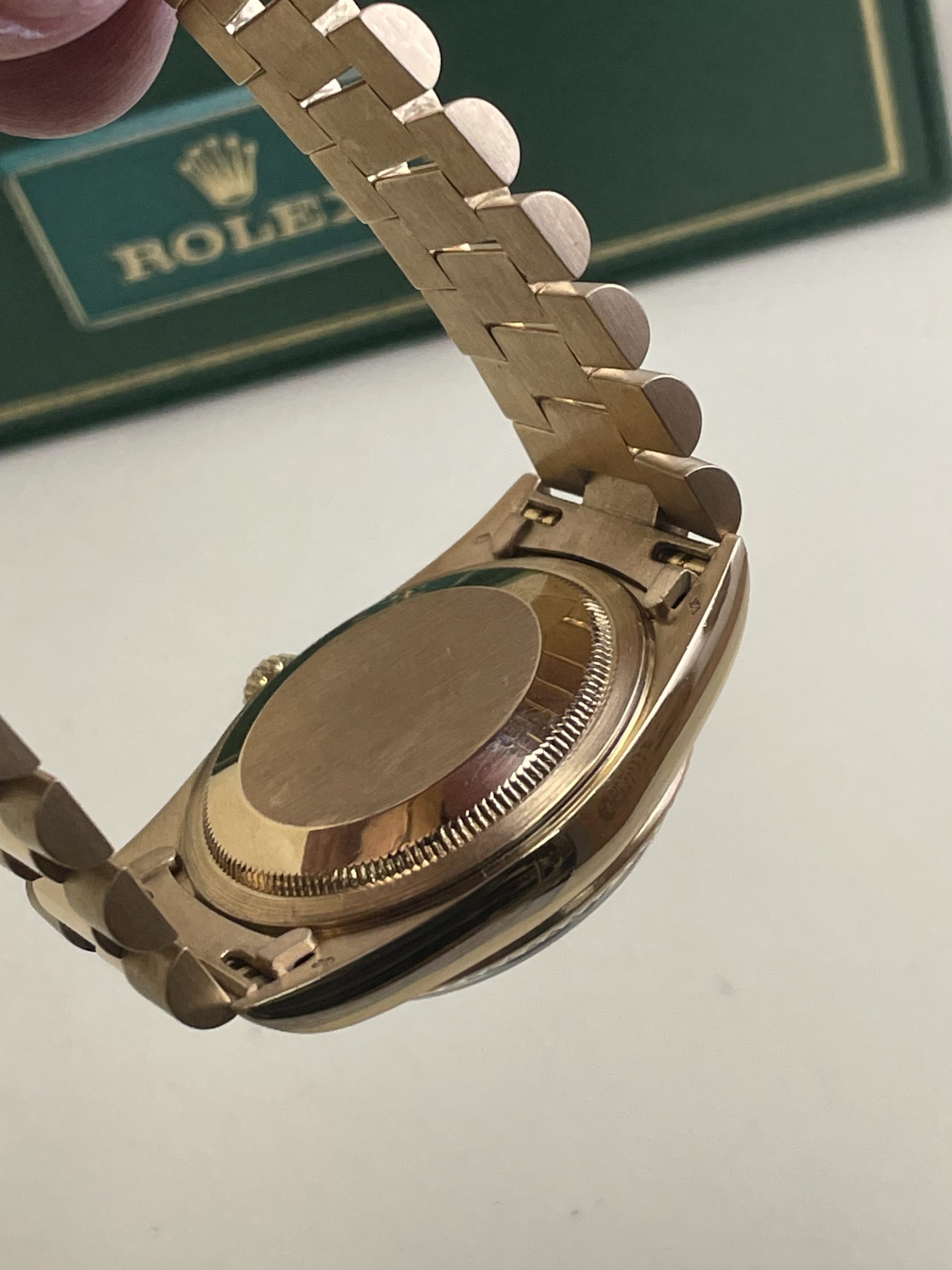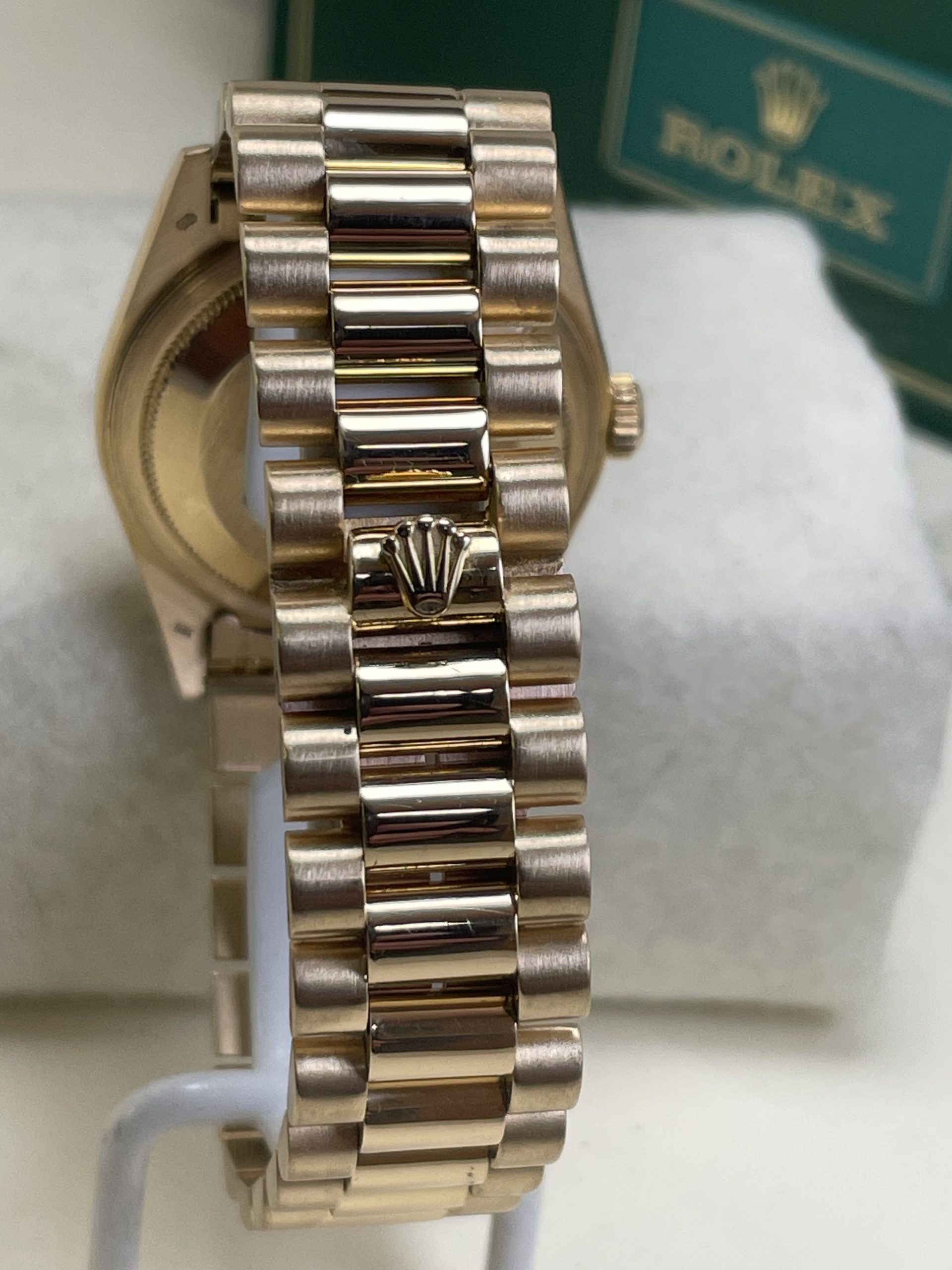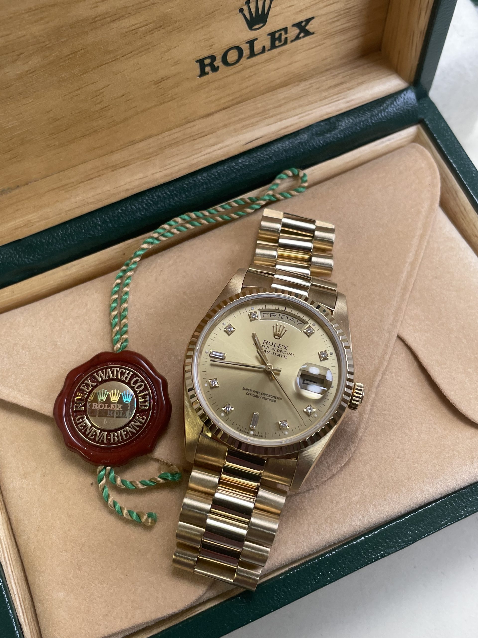Rolex Day-Date 18K Solid Yellow Gold. L Serial Dates this timepiece to 1989/1990. This is a classic from the Rolex line-up and is instantly recongizable anywhere across the world. Bracelet is in good shape and will fit approximately 7.5 inch wrist. This is a “double-quickset” model where the day and the date can be changed independently, caliber 3155. Sapphire crystal. Factory diamond dial is in flawless condition as is the bezel & hands of this watch. Comes with watch and Rolex box. Detailed, fully serviced, guaranteed. $17,850 Wire/ Certified funds.