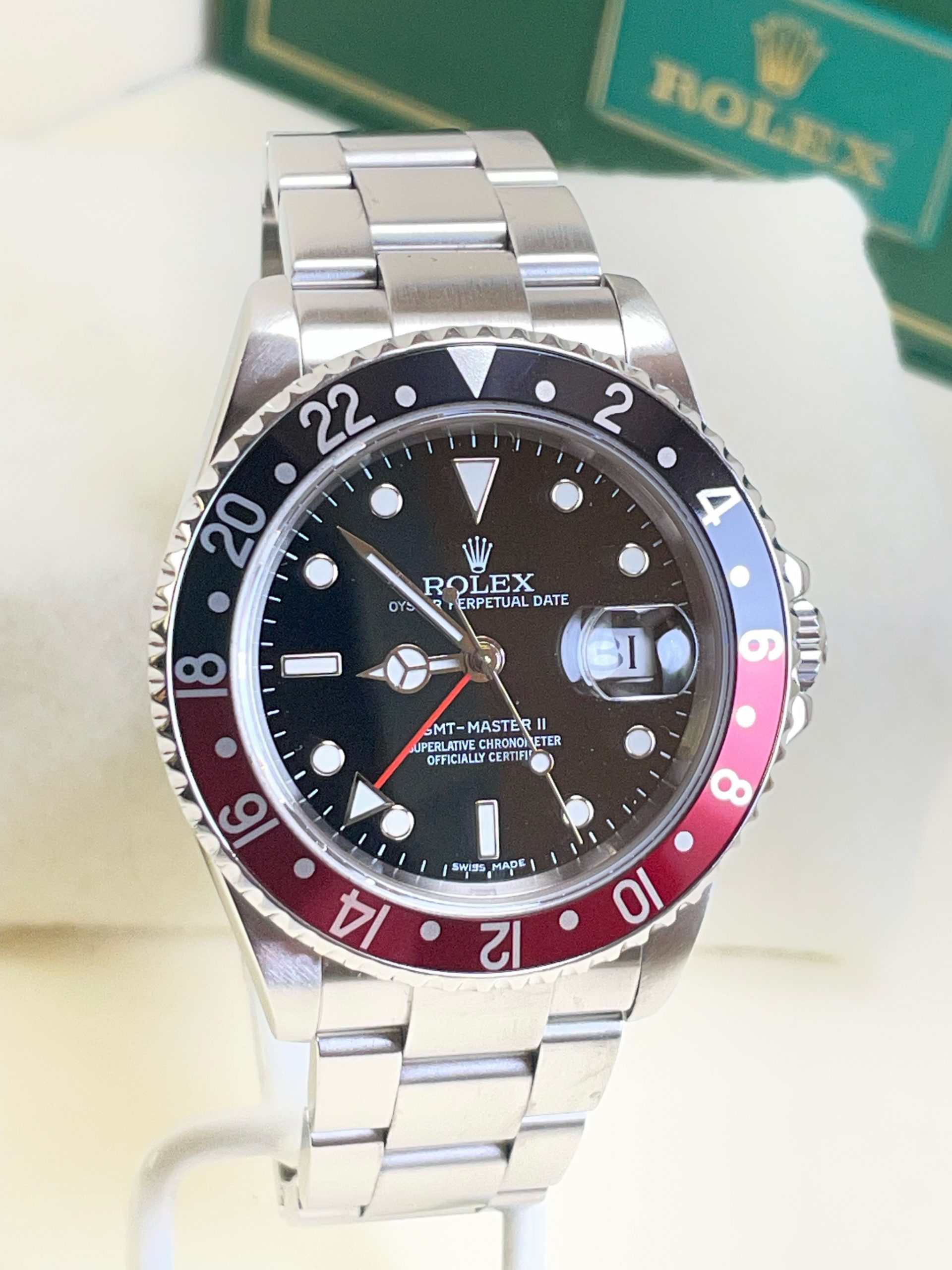 Rolex GMT Master II #16710. “Z Serial” Dates this to the late 2000’s. 40MM Case Size. Automatic watch with 24 hour bezel and GMT Complication to track multiple time zones. Beautiful Condition Timepiece, Crisp Oyster Bracelet, Full Links. Desirable “Solid Endlinks” model. Tight band and clasp. Beautiful original “Swiss Made” dial and stunning red/black “Coke” bezel insert. Clean 3185 Movement, timing well. Comes with it’s original box, warranty papers, serialized hangtag, and even full documentation from Rolex where the watch went through full service and “certified pre-owned” program. Detailed, Serviced, Guaranteed. $14,000 wire/certified funds