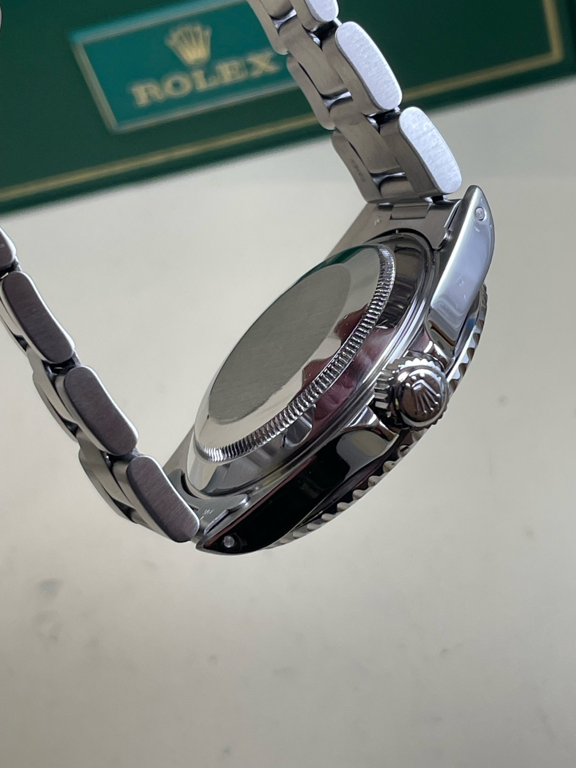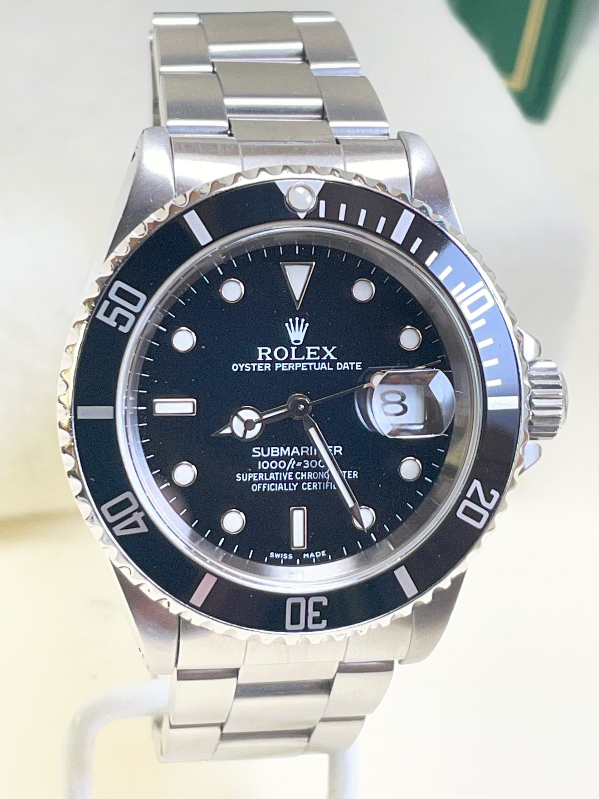 S-304. Submariner #16610, 2000’s model. The classic steel Submariner of James Bond fame in crisp, detailed condition with original warranty papers and Rolex box. 40MM Case Size. Original luminous dial, sapphire crystal. Tight band and clasp. Flawless dial and aluminum bezel insert. The most iconic tool watch of all time. Detailed, Serviced, Guaranteed. With it’s original box & warranty papers. $9,950 wire/certified funds.